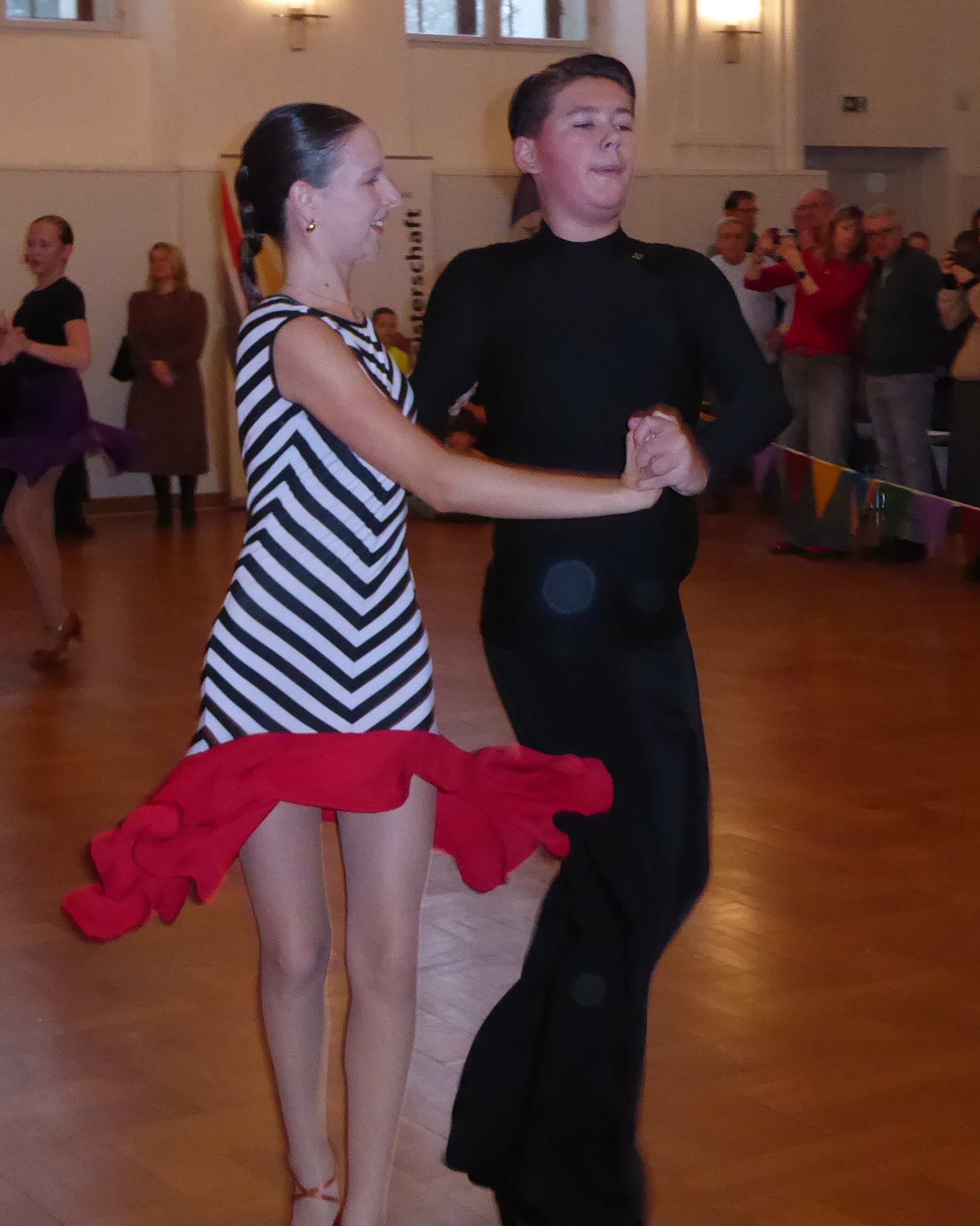 Erste Turniererfahrungen sammelten Alexander und Helena, die erst seit wenigen Wochen zusammen tanzen, in der Hauptgruppe D. Zum ersten Mal bei den Erwachsenen starteten im Anschluss auch Fynn und Theresa und holten im größten Feld des Tages mit 14 Paaren, in der Hauptgruppe C, den 2. Platz hinter einem Thüringer Paar – und damit den Landesmeistertitel.