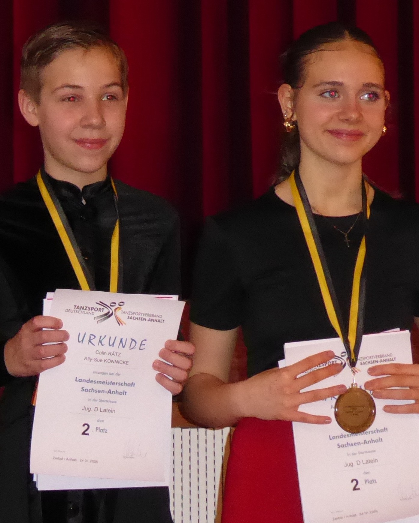 Ganz früh schon starteten Eddy und Paulina bei den Kindern D. Müdigkeit zeigte sich bei den beiden aber überhaupt nicht und so räumten sie, während andere noch beim Frühstück saßen, auf Fläche 1 im Saal der Stadthalle Zerbst den ersten Landesmeistertitel dieses Tages für den 1. TSC Dessau ab. Zeitgleich starteten Colin mit Ally-Sue und Vincent mit Cheryl auf Fläche 2 bei den Junioren II D. Colin und Ally-Sue verpassten knapp das Treppchen, aber holten mit ihrem 4. Platz im Turnier den 3. Platz der Landesmeisterschaft. Die amtierenden Landesmeister Vincent und Cheryl gewannen alle Tänze und verteidigten damit souverän ihren Titel. Als Turniersieger und mit diesem Erfolg frisch in die C-Klasse aufgestiegen durften sie direkt bei den Junioren II C mittanzen, wo sie auf ihre Teamkollegen Moritz und Hannah trafen. Dort sammelten sie erste C-Klasse-Erfahrungen, während Moritz und Hannah einen Tanz nach dem anderen gewannen und am Ende auf dem Siegerpodest standen mit Turniersieg, Landesmeistertitel und allen gewonnen Tänzen. Eddy und Paulina wiederum starteten ebenfalls noch einmal, nun bei den Junioren I D, und wiederholten ihr Ergebnis: 2. Platz, Landesmeistertitel. Gleichzeitig tanzten Colin und Ally-Sue ihr zweites Turnier des Tages in der Jugend D und holten ebenfalls den 2. Platz im Turnier. Für sie bedeutete das den Vizemeistertitel.