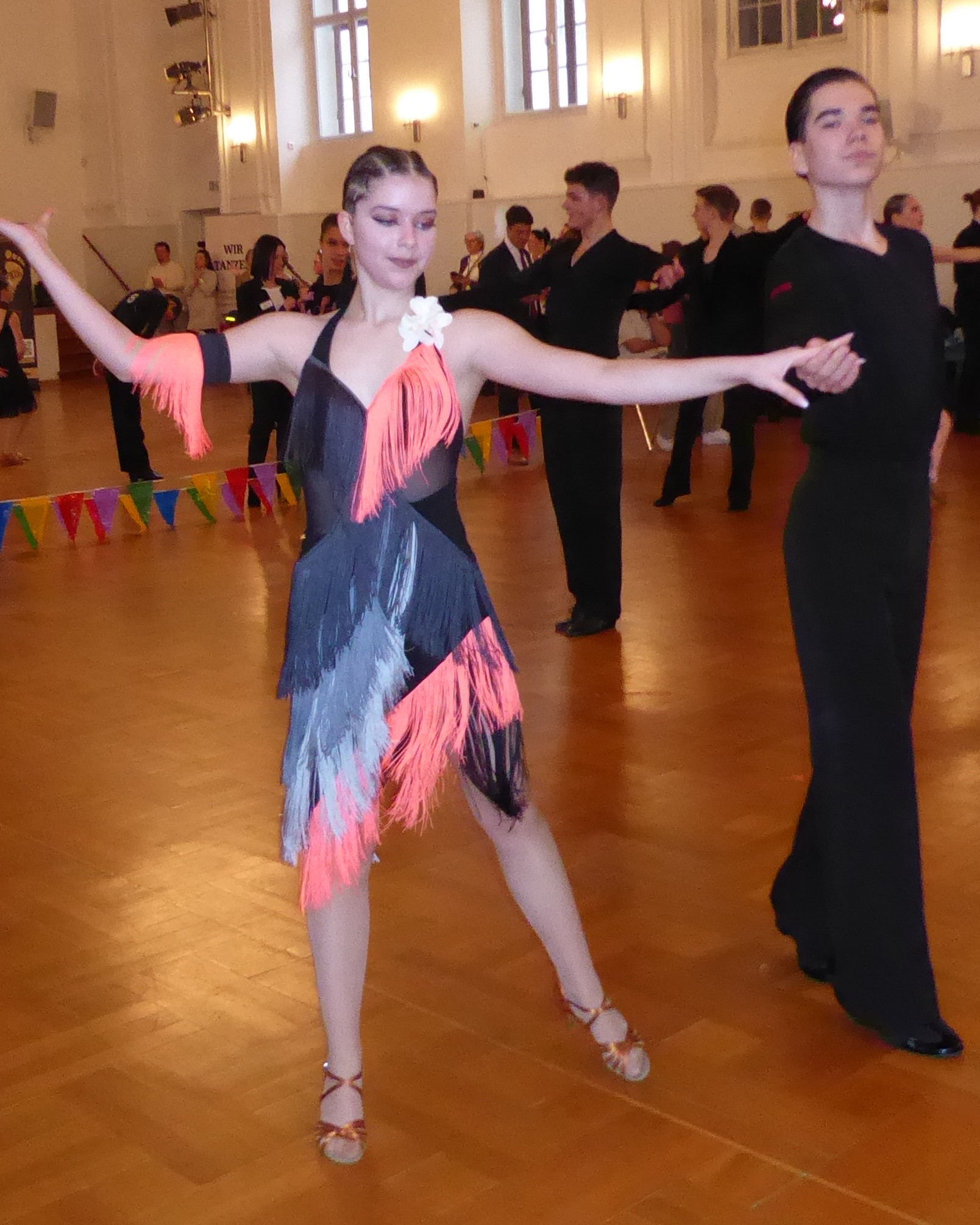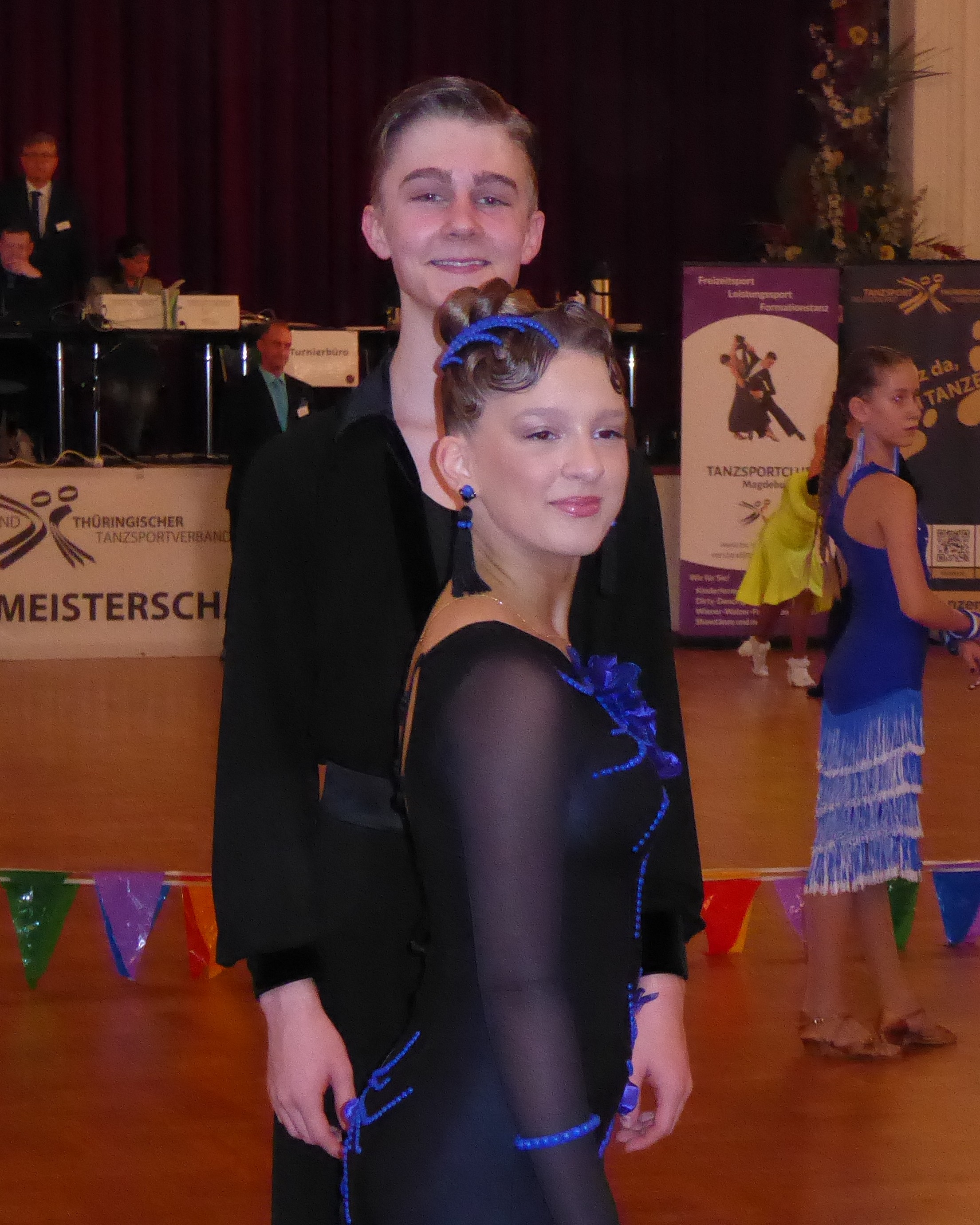 Erste Turniererfahrungen sammelten Alexander und Helena, die erst seit wenigen Wochen zusammen tanzen, in der Hauptgruppe D. Zum ersten Mal bei den Erwachsenen starteten im Anschluss auch Fynn und Theresa und holten im größten Feld des Tages mit 14 Paaren, in der Hauptgruppe C, den 2. Platz hinter einem Thüringer Paar – und damit den Landesmeistertitel.