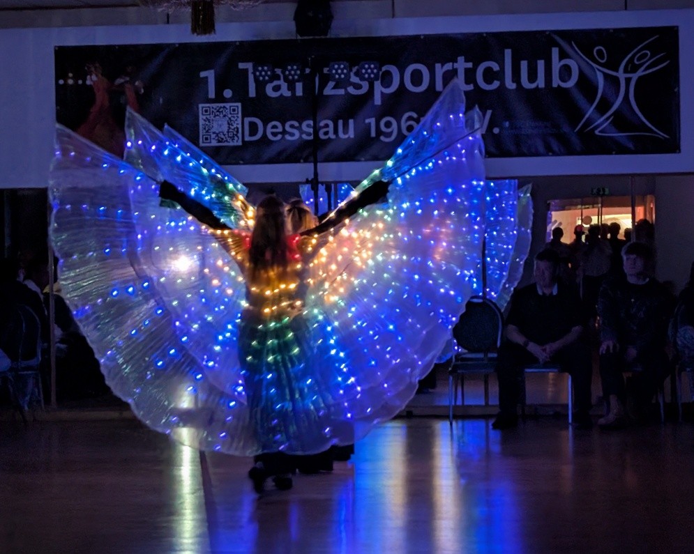 Dann wurde es spannend, Ingo sorgt dafür das alle Lichter gelöscht wurden. Selbst die dezente Hintergrundbeleuchtung die unser DJ installiert hatte musste aus. Es war schon ganz schön dunkel und dann kamen die Mädels von DanceGlow und brachten den Saal zum Leuchten: